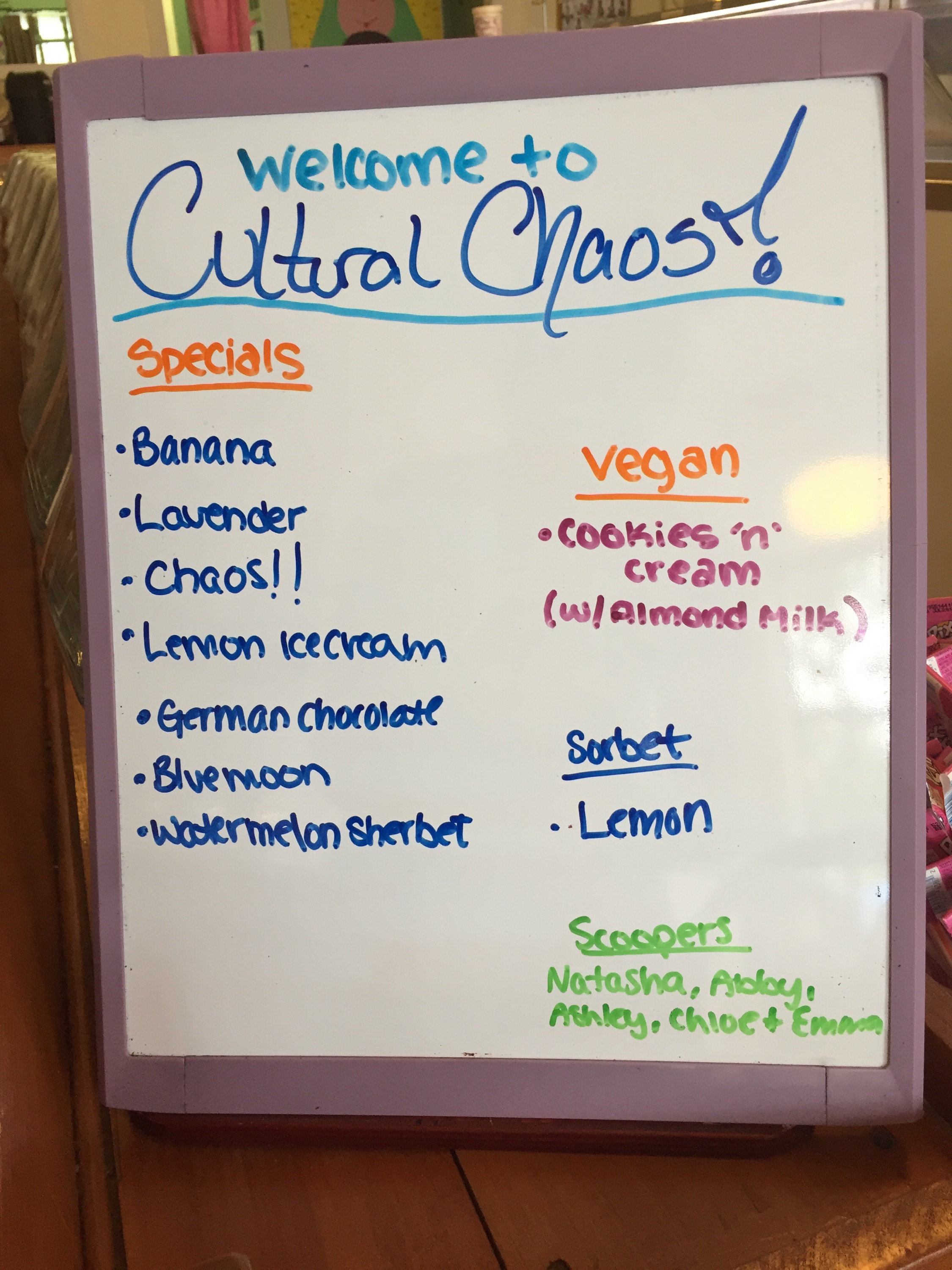 WELCOME TO CULTURAL CHOAS!!! (6/11) The Chaos special today is: butter base, caramel and fudge swirl, mini marshmallows, mini m&m’s and chocolate chips! Share this: Share on X (Opens in new window) X Share on Facebook (Opens in new window) Facebook Like Loading... Related